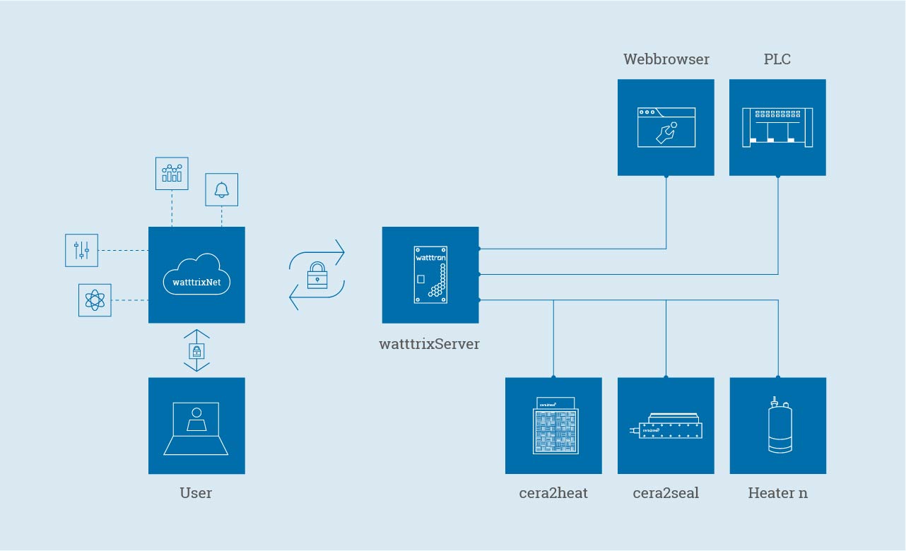 Die Heizer werden über den watttrixServer gesteuert und können in Echtzeit überwacht werden. Der Zugriff erfolgt über einen Web Browser oder einem SPS-Controller (mittels EthernetIP, ModbusTCP oder ProfiNet).